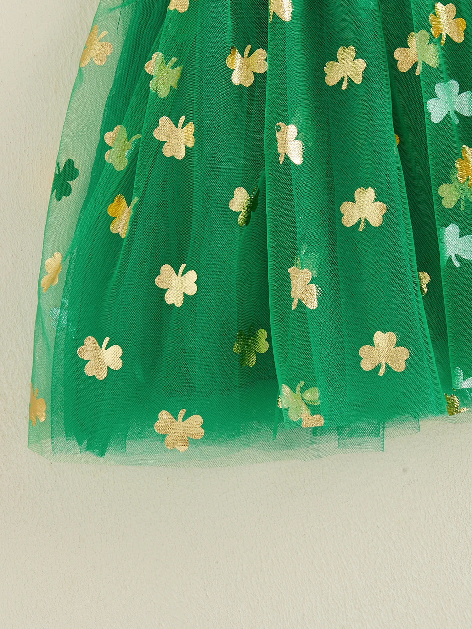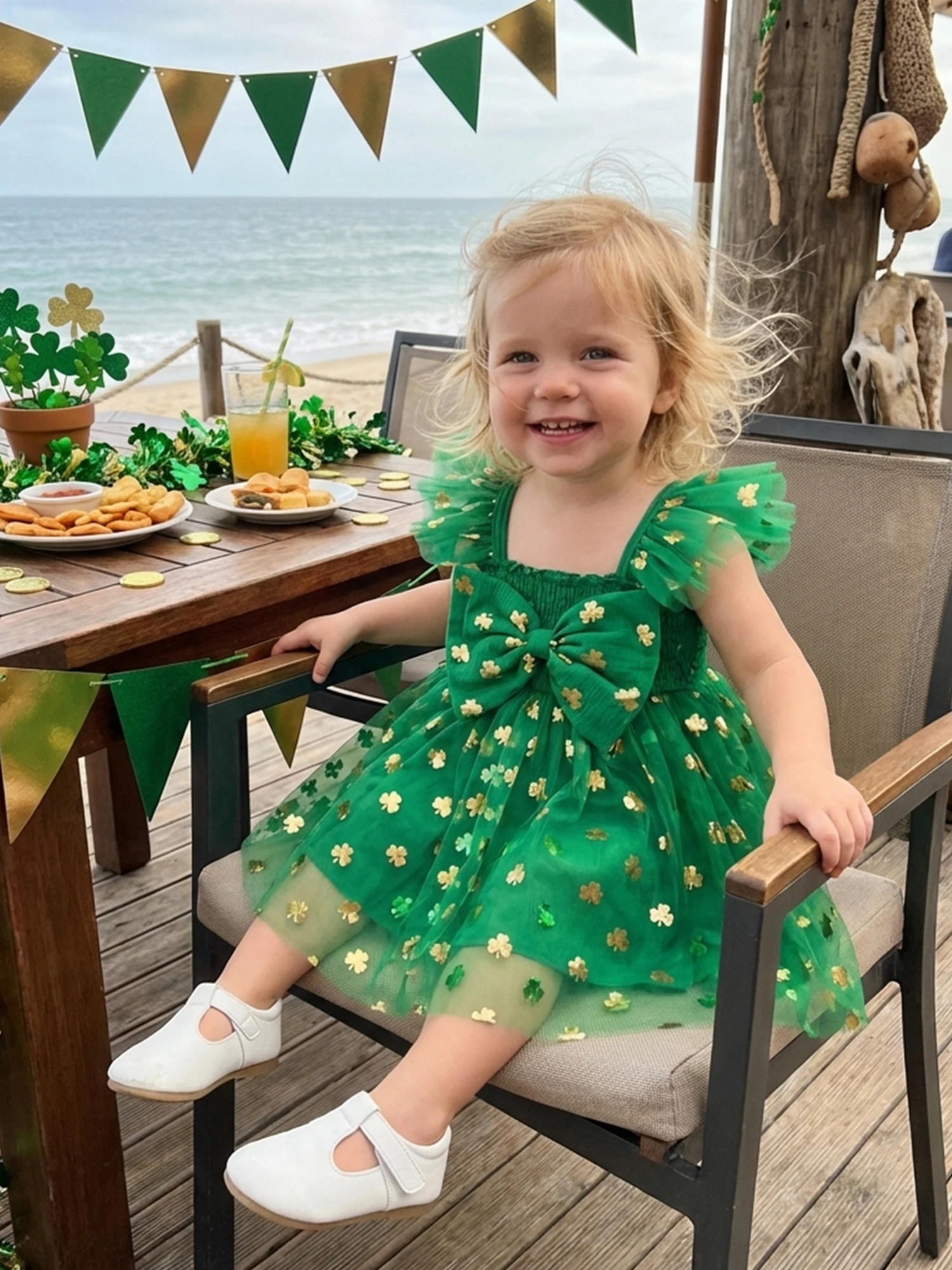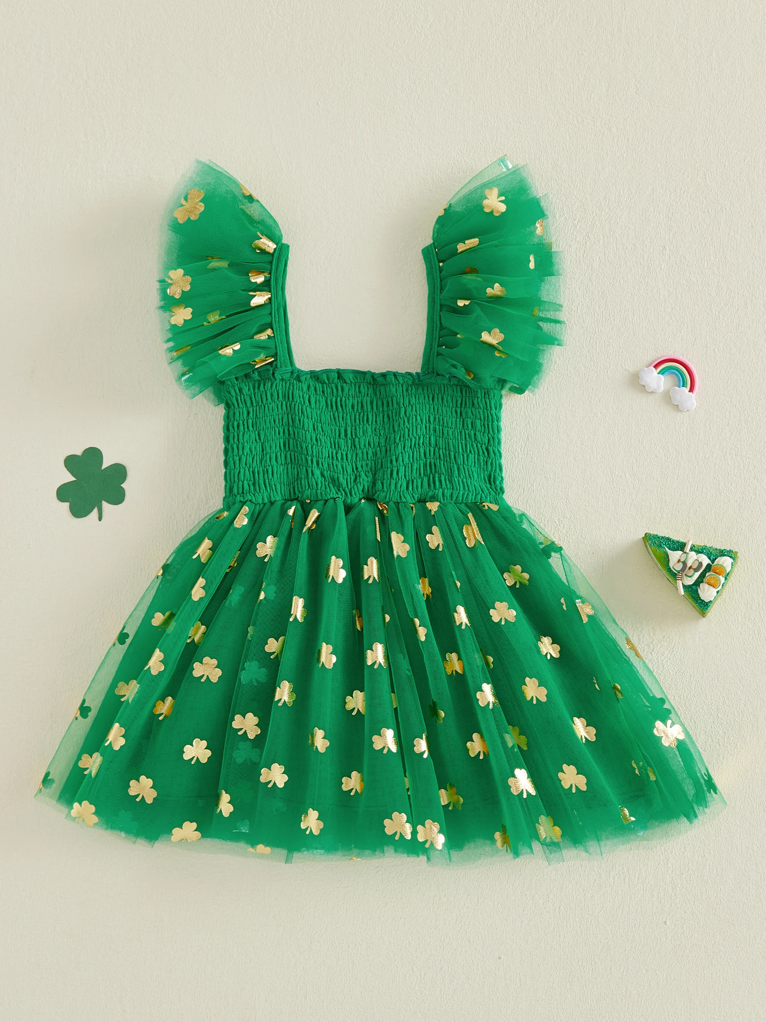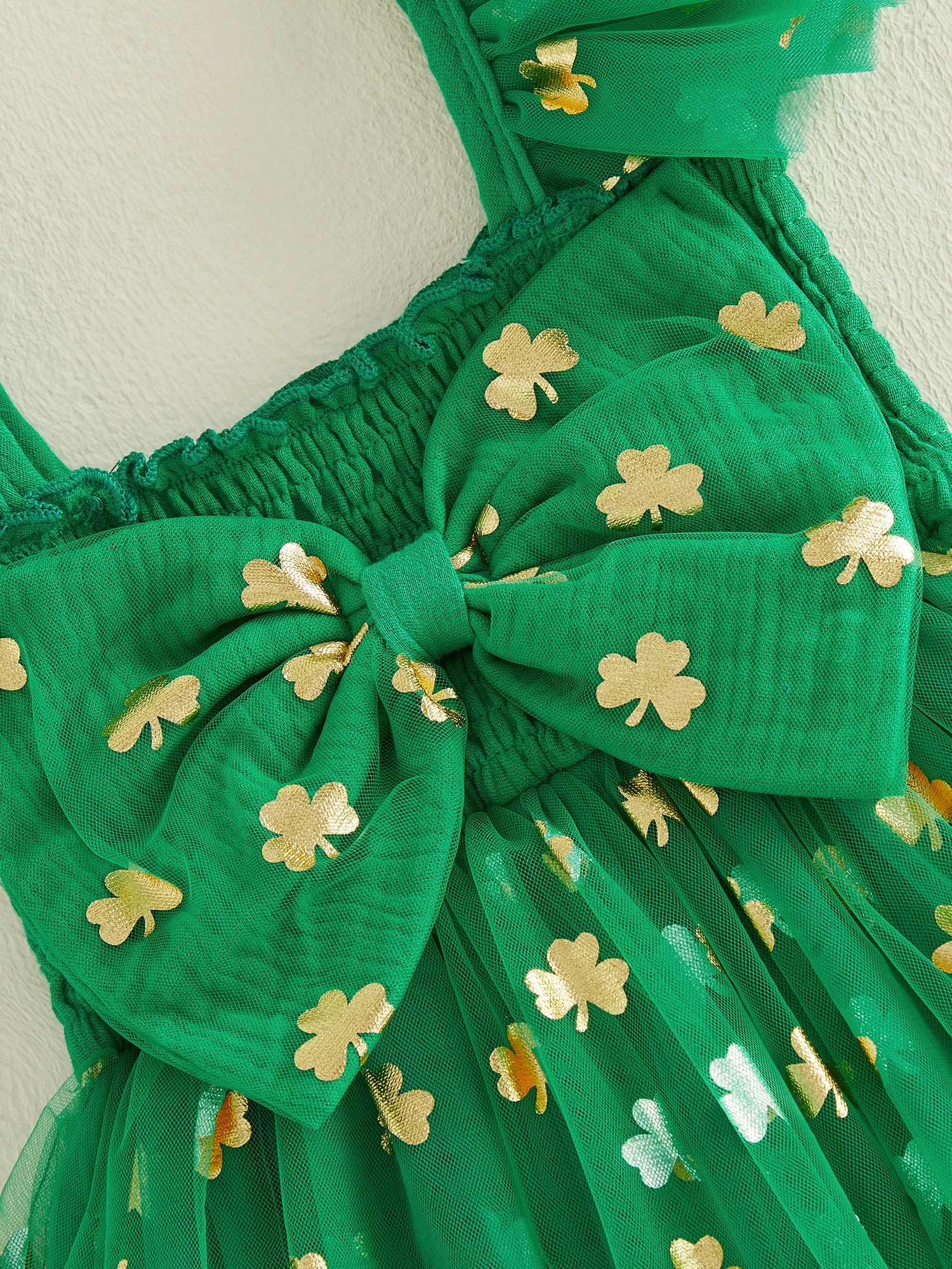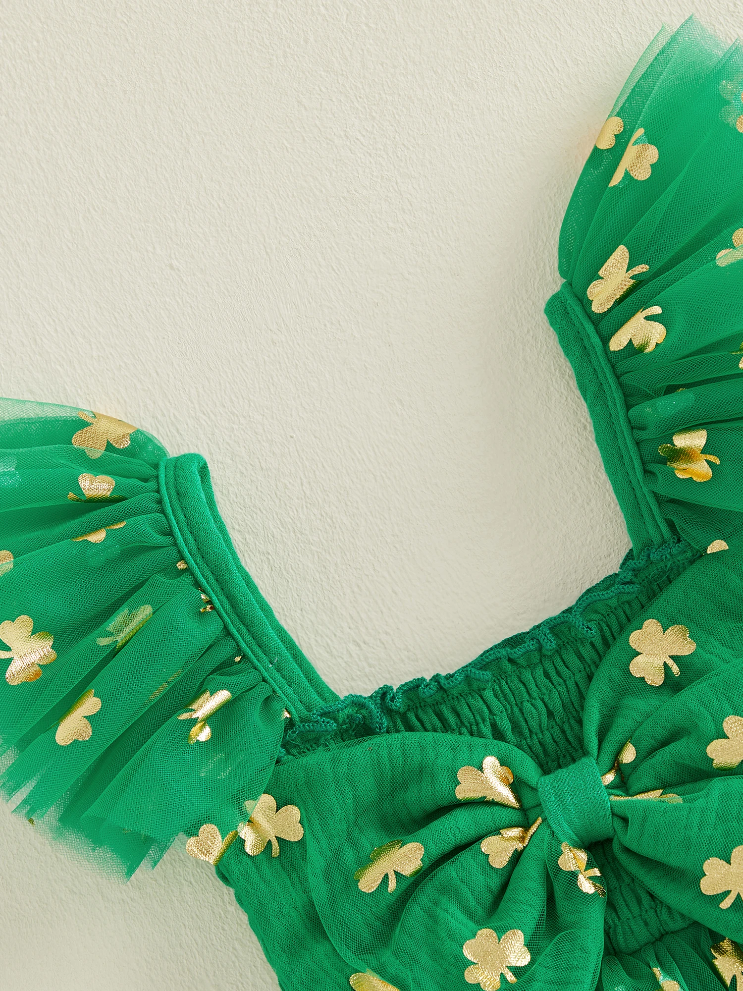 Twirl into luck with this enchanting green dress fit for a little princess! Adorable ruched detailing hugs the silhouette while dramatic ruffled shoulders add a touch of whimsy. A statement bow crowns the neckline, and shimmering gold shamrocks scattered across the fabric catch the light with every magical movement. Perfect for celebrations, dress-up days, or whenever your child wants to feel extra special and sparkly.